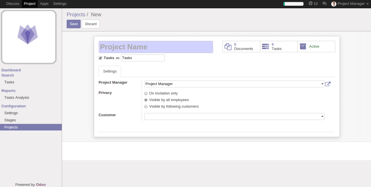 In project form, we can set project manager, privacy, and customer from the settings tab. Project Privacy: